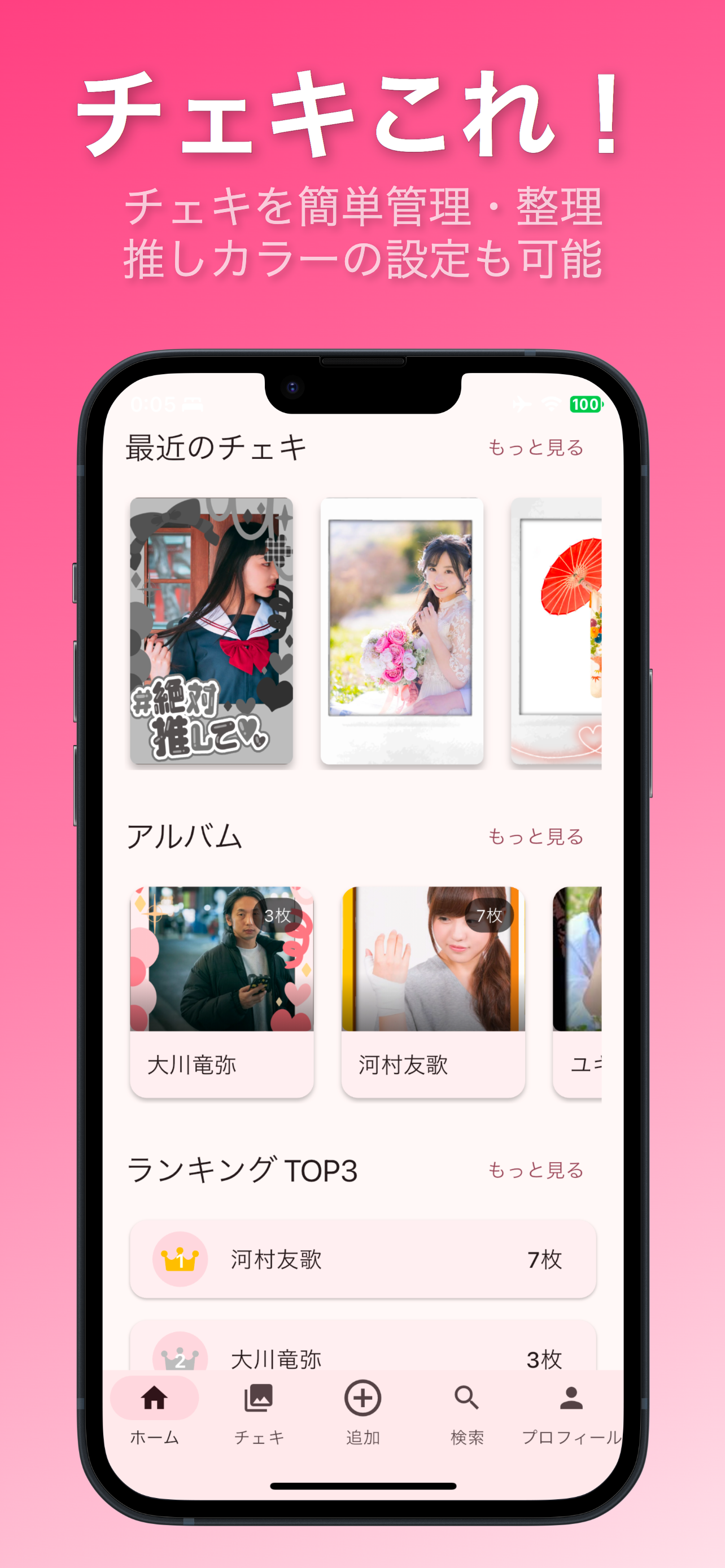 推しの登場回数をランキング表示。誰のチェキを一番多く持っているか一目でわかります。
